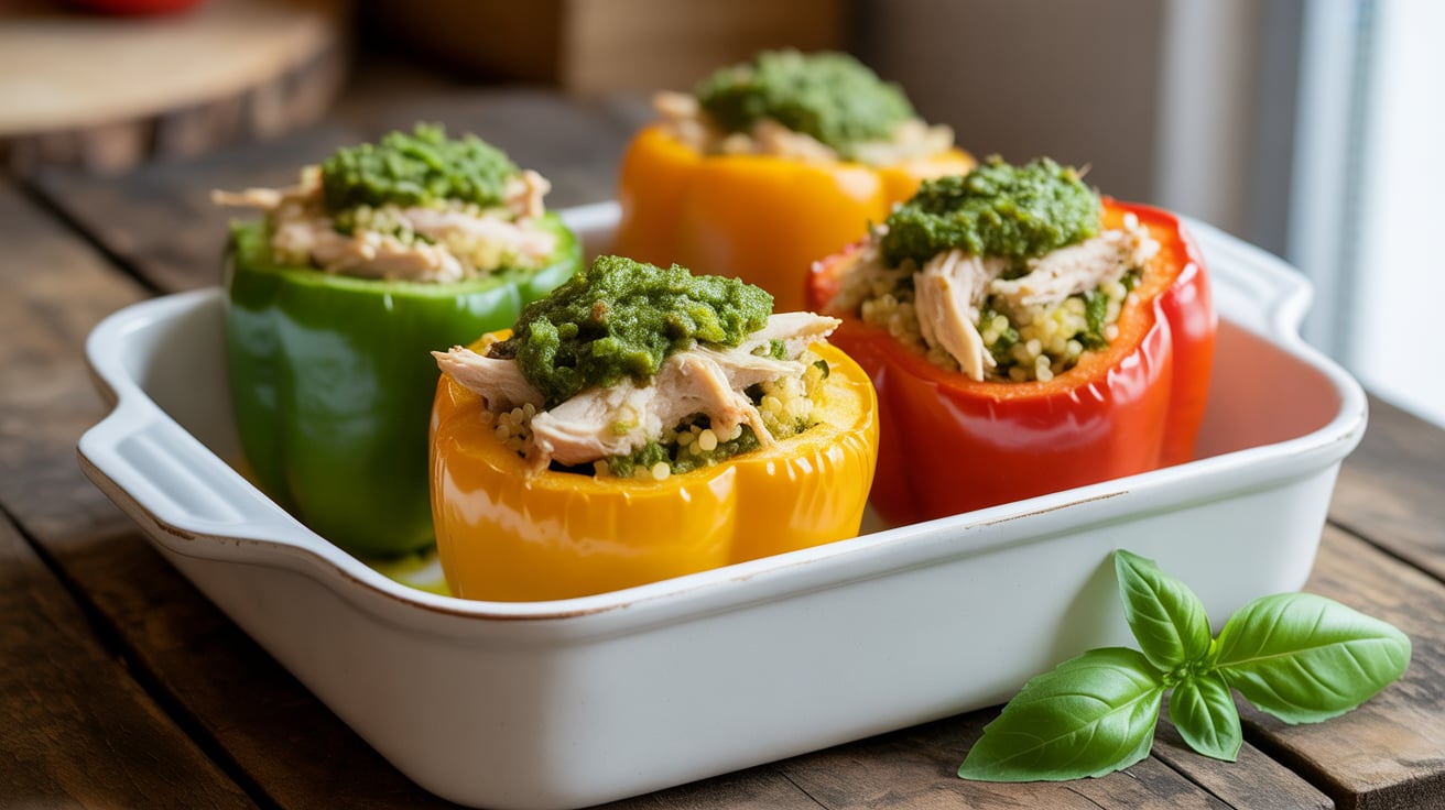 Looking for a healthy, colorful dinner idea? These Pesto Chicken Stuffed Peppers are packed with protein, flavor, and fresh ingredients. Sweet bell peppers are filled with shredded chicken, creamy pesto, and melted mozzarella — a comforting meal that’s both nutritious and easy to make.